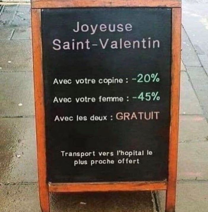 Joyeuse Saint-Valentin: Avec votre copine -20%, avec votre femme -45%, avec les deux : Gratuit.