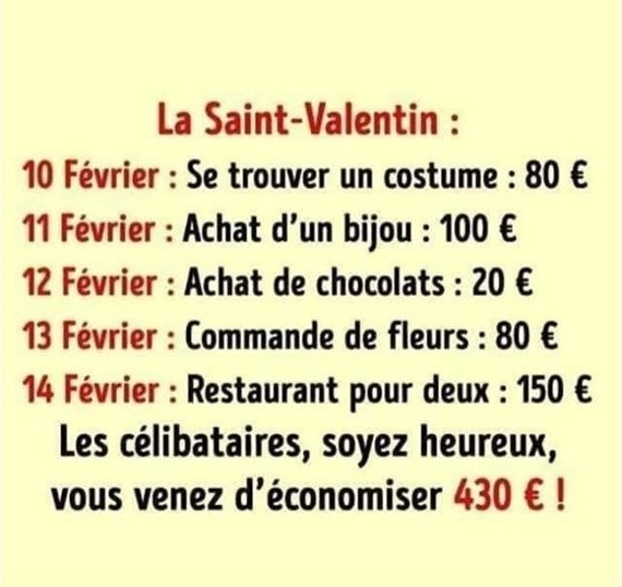 Saint-Valentin, j'ai tellement hâte de payer un resto romantique et un bouquet de fleurs à personne.